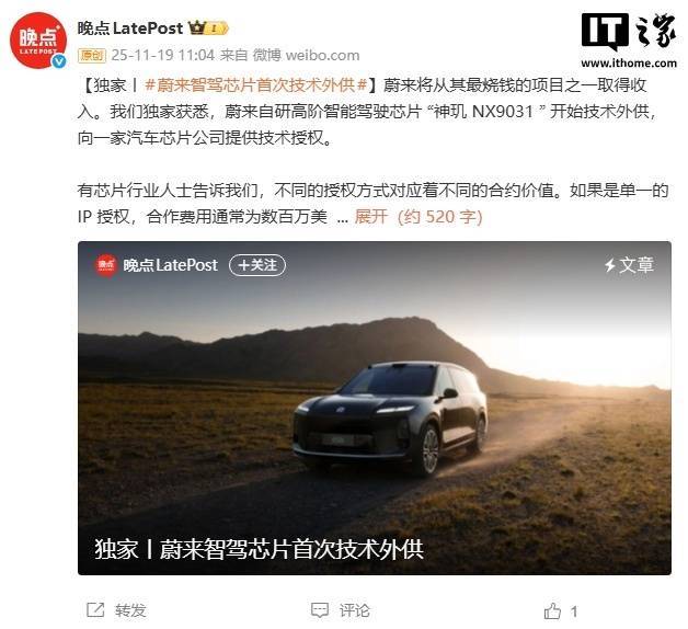 IT之家 11 月 19 日消息,《晚点 LatePost》今日报道称,蔚来汽车自研的高阶智能驾驶芯片“神玑 NX9031”已启动技术对外授权,合作方为一家汽车芯片公司。据介绍,这款芯片采用 5nm 车规级工艺制造,公开数据显示其算力约为英伟达 Orin-X 芯片的四倍。